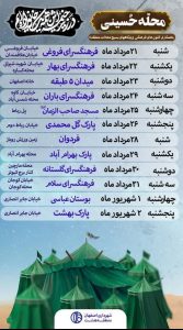 مدیر منطقه۸ شهرداری اصفهان، خاطرنشان کرد: ویژه برنامه محله حسینی از روز سهشنبه ۲۴ مردادماه در مسجد صاحبالزمان (عج) برگزار میشود و در روزهای بعدی نیز در پارک گلمحمدی، محله فردوان، پارک بهرامآباد، فرهنگسرای گلستانه، فرهنگسرای سلام، بوستان عباسی و پارک بهشت برگزار خواهد شد.