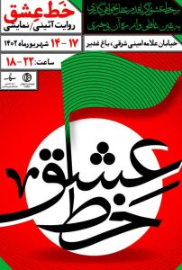 نخستین برنامه، «خط عشق» نام دارد که در قالب روایتی آیینی نمایشی از ۱۴ تا ۱۷ شهریورماه از ساعت ۱۸ تا ۲۲ در باغ غدیر واقع در خیابان علامه امینی میزبان عموم شهروندان است.