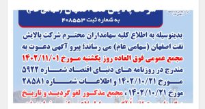 بدینوسیله به اطلاع کلیه سهامداران شرکت پالایش نفت اصفهان میرساند، پیرو آگهی دعوت به مجمع عمومی فوق العاده روز یکشنبه مورخ ۱۴۰۲/۱۱/۰۱ ، مجمع مذکور لغو گردید و تاریخ برگزاری، متعاقبا اطلاع رسانی خواهد شد.