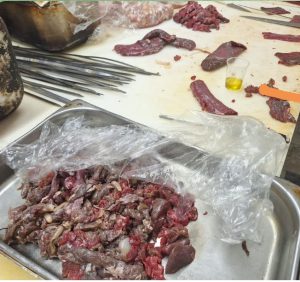 وجود گوشت خام مانده و رنگ برگشته بر روی تخته کاری در هنگام سیخ نمودن و آماده سازی که بنا به اظهار کارشناس مرکز بهداشت قابلیت مصرف انسانی نداشته و در صورت پخته شدن دیگر قابلیت تشخیص ظاهری محقق نمی شد.