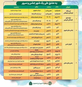 مدیر منطقه ۱۲ شهرداری اصفهان هم گفت: بهمناسبت دهه ولایت و امامت ۷ شب در ۷ محله در شهرک مهدیه، شهرک نگین، بوستان صدف، بوستان قدس، خیابان امین و بوستان ملت جشنهایی برگزار میشود.