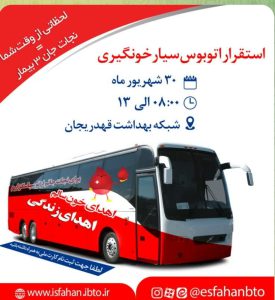 کیان دهراب پور مدیرکل انتقال خون استان گفت به خاطر کاهش شدید ذخایر خونی در استان اصفهان، روز جمعه ۳۰ شهریور، تیم سیاری اداره کل انتقال خون اصفهان در مرکز جامع خدمات سلامت شهر قهدریجان از ساعت ۸ صبح الی ۱۳ حضور پیدا خواهد کرد تا از اهداکنندگان عزیز خون برای رفع نیاز بیماران محتاج به خون و فرآورده های خونی اقدام به خونگیری نماید.
