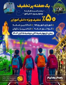 مدیرعامل شرکت توسعه مجتمعهای سیاحتی، فرهنگی و ورزشی سپاهان شهرداری اصفهان گفت: بهمناسبت هفته نوجوان و دانشآموز ابرسازههای تفریحی اصفهان شامل تلهکابین صفه، تلهسیژ ناژوان، شهربازی شهر رویاها و مجموعه کوه نور صفه با تخفیف ۵۰ درصدی قابل استفاده خواهند بود.