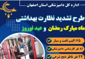 در راستای صیانت از ایمنی و امنیت غذایی و حفظ سلامت عموم مردم جامعه در ماه مبارک رمضان و عید نوروز ۱۴۰۴ ،هماهنگ با سراسر کشور اقدام به اجرای طرح تشدید نظارت بهداشتی دامپزشکی ویژه این ایام در استان اصفهان می نماید.