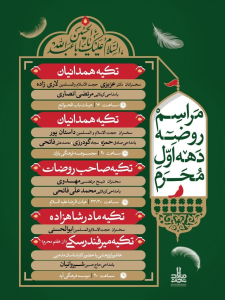 وی افزود: این مراسم در تکیه همدانیان با سخنرانی دکتر عزیزی و حجتالاسلام لاریزاده با مداحی مرتضی انصاری ساعت ۱۶:۰۰ هیئت بابالحوائج و از ساعت ۲۰:۰۰ حجت الاسلام و المسلمین داستان پور با مداحی صادق حمزه سجاد گودرزی و محمد علی فاتحی توسط مجموعه فرهنگی باران برگزار میشود.