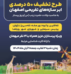 مدیرعامل شرکت توسعه مجتمعهای سیاحتی، فرهنگی و ورزشی سپاهان شهرداری اصفهان از اجرای طرح تخفیف ۵۰ درصدی برای پرستاران و خانوادههای آنها در ابرسازههای تفریحی شهر به مناسبت ولادت حضرت زینب (س) و روز پرستار خبر داد و گفت: این طرح از سوم تا نهم آبان سال جاری اجرا میشود.